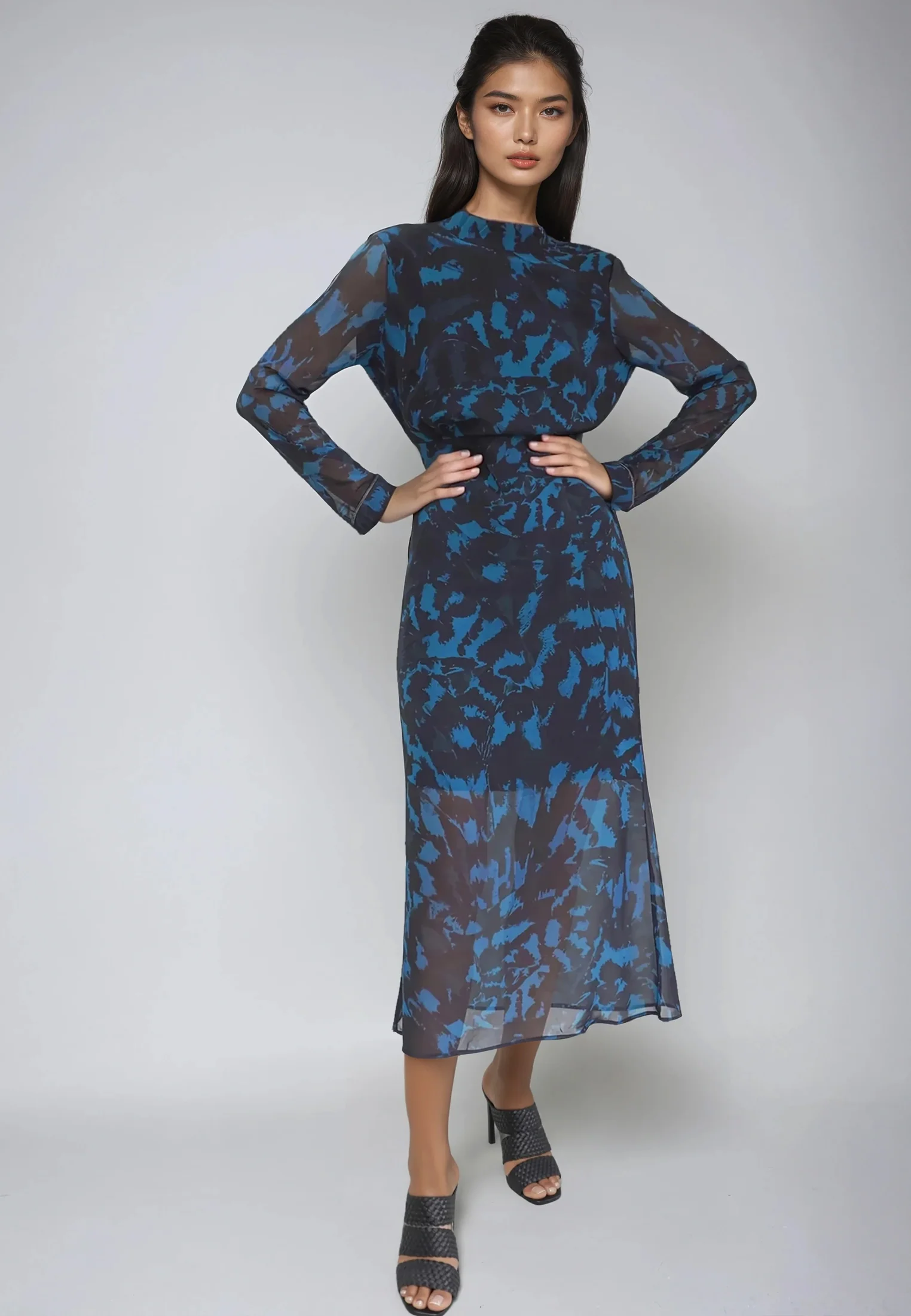 The Dazzle dress will make a chic addition to any wardrobe with its hand-painted feather print in teal and blue tones while the open-back silhouette adds a dramatic touch. This easy-fit dress features a midi length, long sleeves, elasticated back waist, high neck and tie back. The perfect addition to any occasion wears wardrobe. This style is made with 50% recycled fabric made of plastic bottles. The dress comes in a selection of prints: Alabaster, fierce and Down print. This style has a regular fit, the model wears a size S.