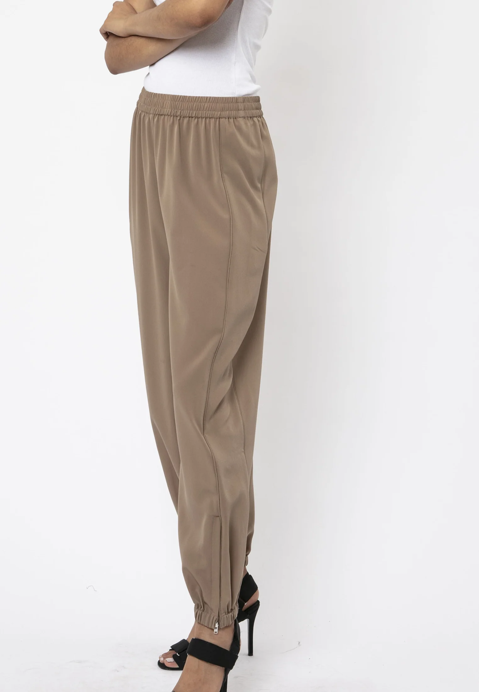 Update your trouser collection with the Society trousers. Made in a lightweight textured crepe, these are super comfortable with their elasticated waist and cuffs and self-fabric piping detail down the side. The trousers have a dressy utility feel, which looks great worn casual with trainers or sandals or as here with heels and our Enterprise top for a casual lux feel.