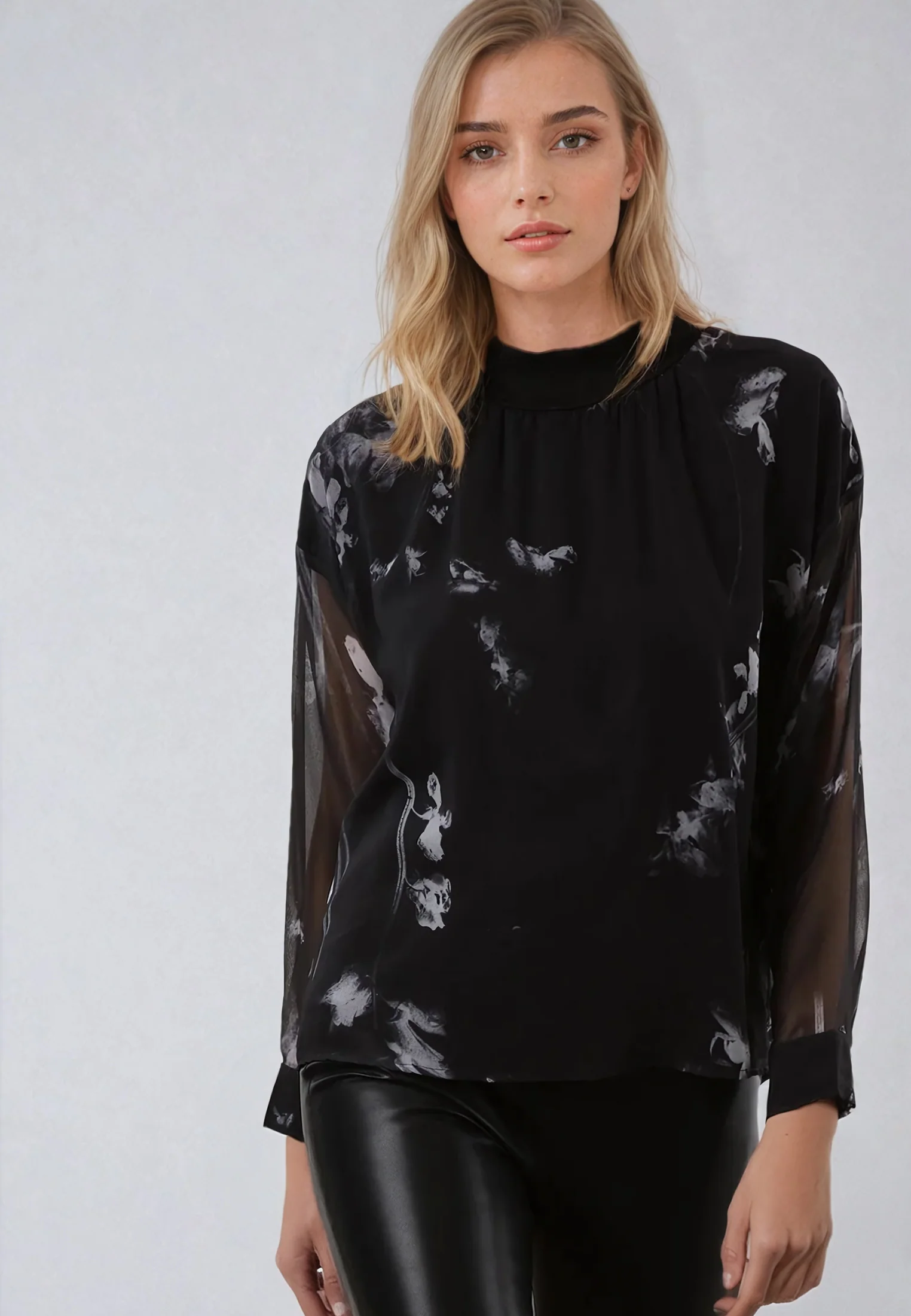 The Sunset top in our floral Cascade print in black and white works as well during the day as in the evening. Crafted in an oversized shape with long sleeves and a viscose rib turtleneck, this easy fit top looks great with tailored trousers or jeans. Wear with the matching Flare skirt for the complete look. The front of the top is lined. The model wears a size S.