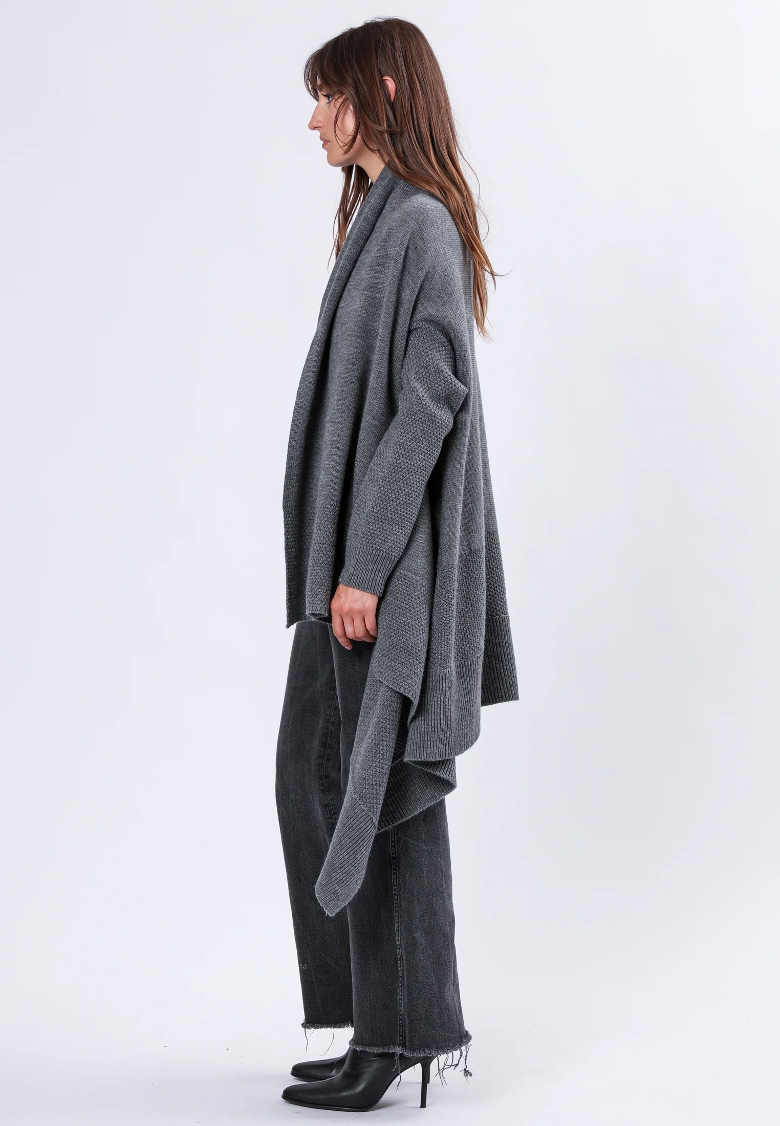 Elevate your style with the Unite Cardigan in charcoal, a knit masterpiece that's not just cozy but also incredibly chic. With its oversized fit, long sleeves, and a trendy handkerchief hem, it effortlessly adds a touch of elegance to your outfit. This cardigan is a versatile layering piece that can transform any look. Whether you're dressing up for a special occasion or simply adding an extra layer for warmth and style, the Unite Cardigan is your go-to choice. Its draped design ensures you look fashion-forward and feel comfortable throughout the day. The model wears a size S. Length: 109 cm